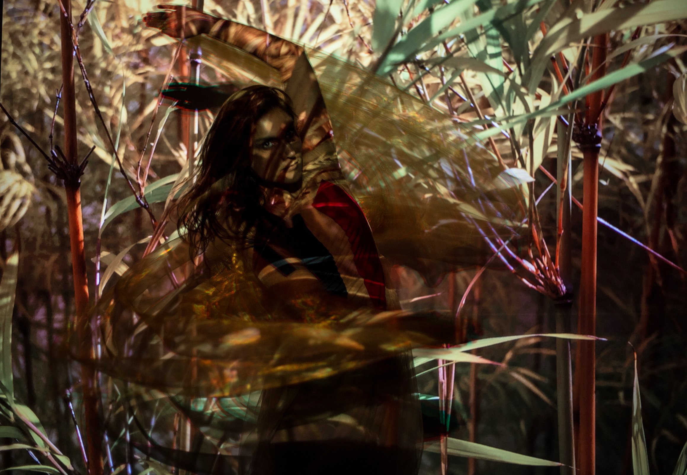 Cenografia da performance multimídia Awakening, de Carolina Berger (2015, 2016). A performance é um tributo às energias femininas de matriz afro-brasileira, uma homenagem à Iansã, orixá do vento e do relâmpago. Tecidos de várias cores e um espelho em acrílico vermelho servem como superfície para projeção de imagens em movimento.